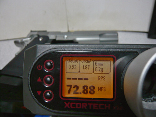 気温は約20℃、0.2g(マルイベアリング研磨0.2g)で73m/s前後。ガスブロのハンドガンの初速としてはいたって普通。