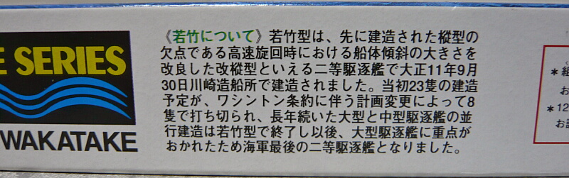 若竹は若竹型駆逐艦の1番艦。イギリスの駆逐艦の模倣から脱却し日本独自設計となった峯風型駆逐艦、その小型版であった二等駆逐艦・樅型の改良型が若竹型です。設計上やや重心が高めであった峯風型の短所が小型化により顕著となってしまったため若竹型では船体を15cmほど拡幅しています。もっともその程度では不十分だったのか、4番艦「早蕨(さわらび)」は1932年、荒天の台湾海峡にて転覆事故を起こし沈没しています。若竹型駆逐艦は八八艦隊計画により23隻の建造が計画されましたが1922年に締結されたワシントン海軍軍縮条約により八八艦隊計画は破棄され、すでに起工していた8隻のみが建造されました。これ以後は大型の一等駆逐艦で統一され、若竹型が最後の二等駆逐艦となりました。(小型の駆逐艦としては戦中期に建造された松型駆逐艦がありますが、実質的には同等の存在であるものの「二等」とは分類されていません)