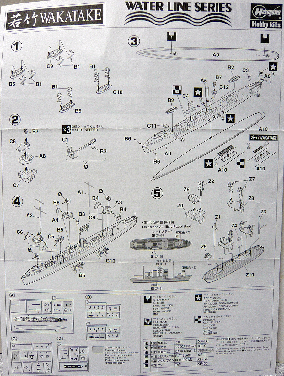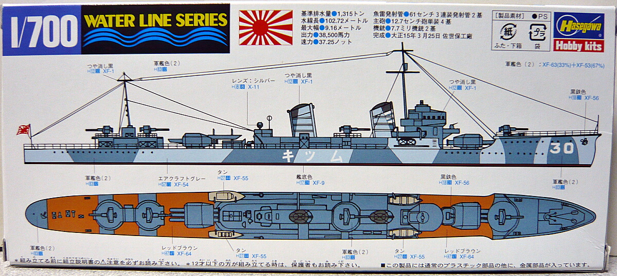 箱下面は塗装図。特徴的な迷彩塗装がされていますが、元の色(軍艦色2)の上にエアクラフトグレーを乗せてゆく塗りになっています。ただどの部分に塗るのかが曖昧で、他社キットの睦月では艦橋が真っ白だったりするので面倒臭い!と思うなら普通に軍艦色2だけの塗装にしてしまってよいでしょう。
