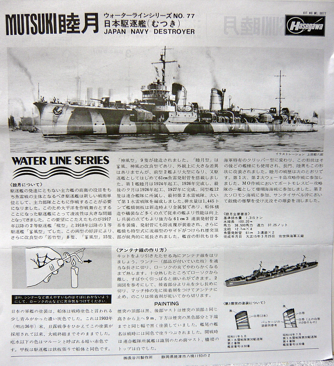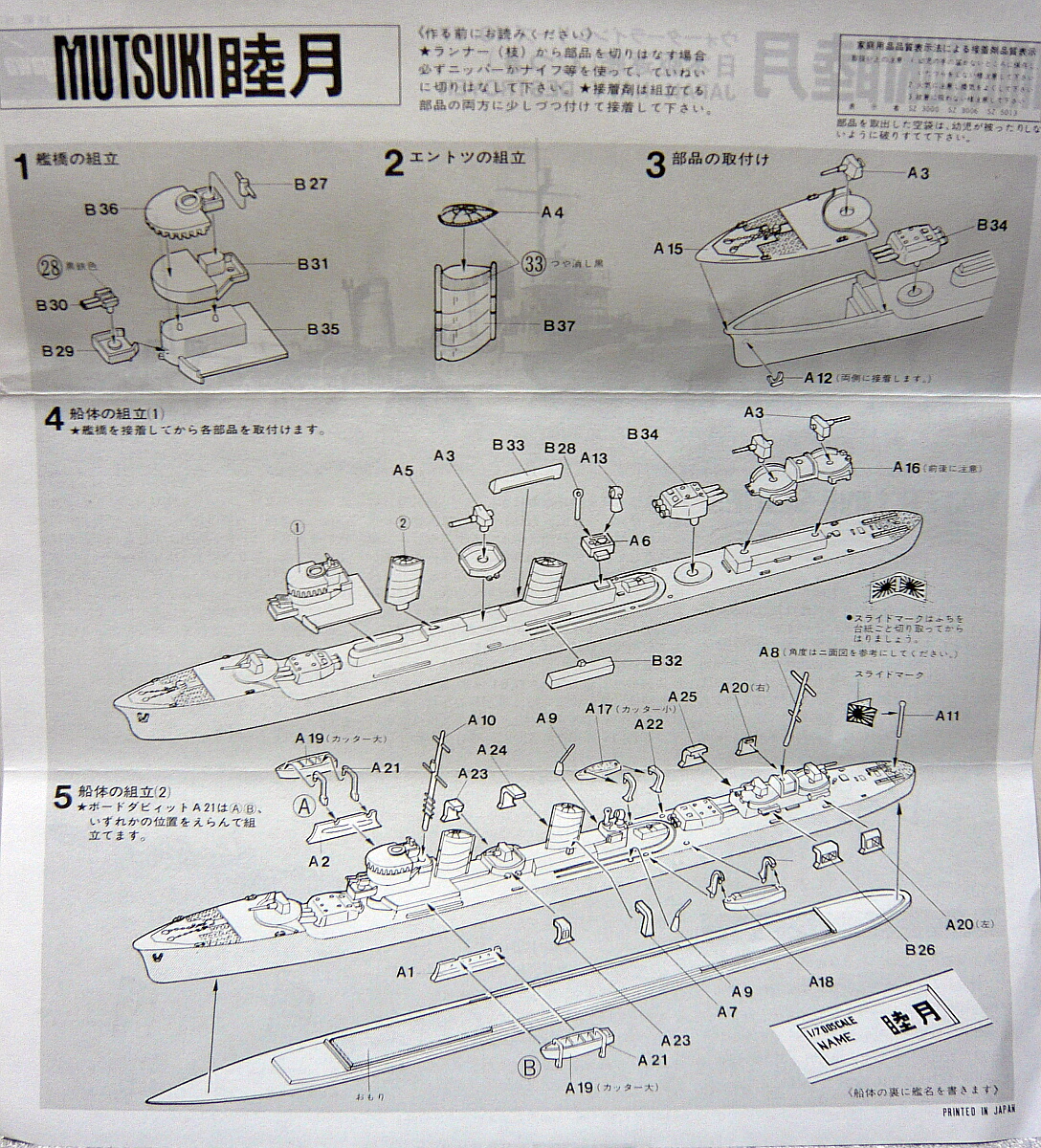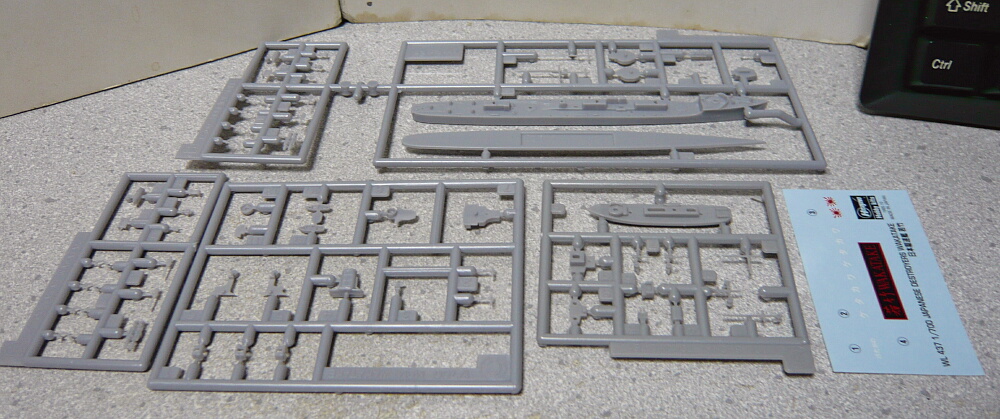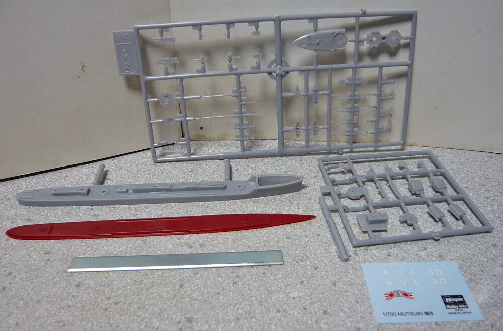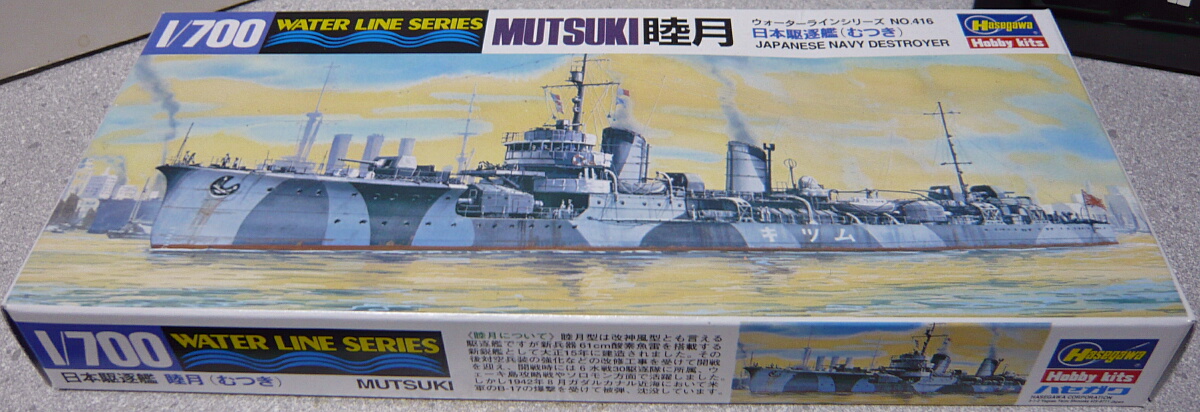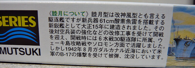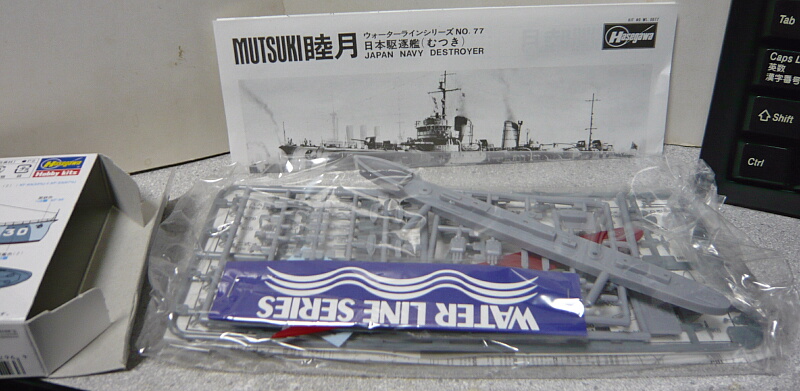 箱サイズはおなじみの小さな駆逐艦キットのもの。以前組んだ三日月の元キットです。このハセガワ睦月は1973年頃からあるキットで、太平洋戦争開戦直前頃に艦橋前に連装機銃を追加、白色の迷彩塗装を施された状態の仕様でキット化され、後に三日月が竣工時の姿で追加されました。