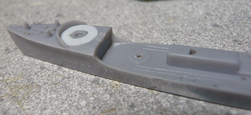 樅の時にググって調べた際、見つけたサイトではハセガワの若竹はかなり樅よりのディテールであり、かといって樅なら正しいかといえばそうでもない。ハセガワ樅を樅として作るならまあ許容範囲ですが、若竹として作ると間違いだらけなのでせめてパッと見でおかしい点だけでも修正してみます。まずは1番砲塔基部。一段下がって放射状のディテールが入っていますが、ここは1段下がらないのが正解のよう。プラ版をワッシャーのような形に切り出し・・・