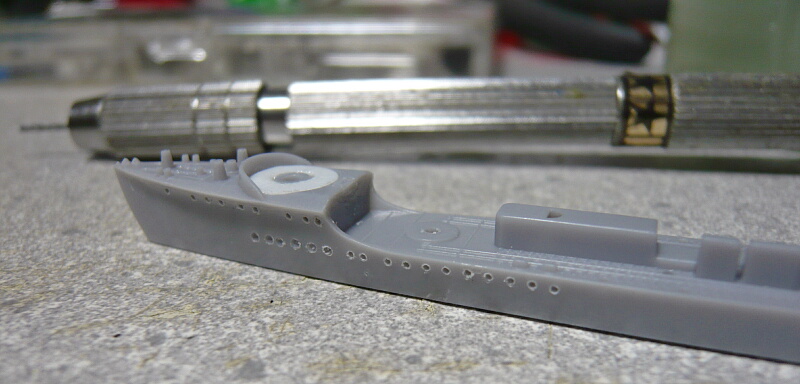 船体側面にはディテールが何も無いので舷窓をピンバイスで開けておきました。