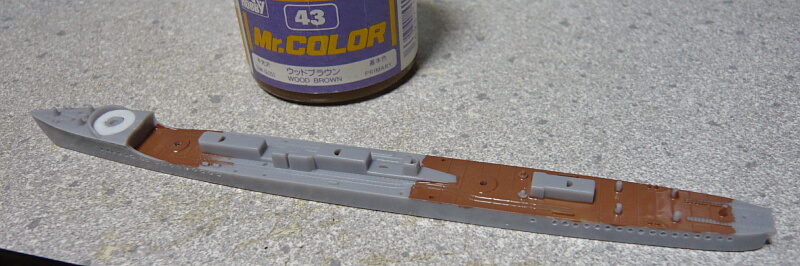 リノリウム色として43ウッドブラウンを塗り、他の部分を32軍艦色2で塗装。リノリウム色に塗る部分は資料や作例や各メーカーの説明書によって違いがあり、どれが正解かわかりません・・・ピットのは艦橋の横もだけど艦尾はもっと前までだし、某所に展示されてる大きな模型は艦首甲板にもリノリウム色の部分があるし。