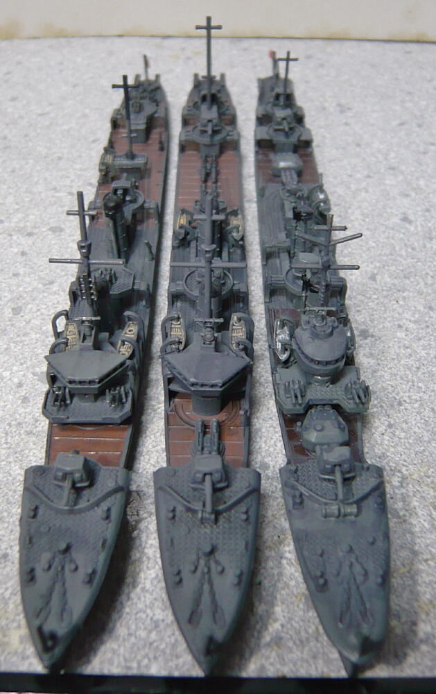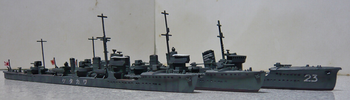 左から夕風(峯風型)、疾風(神風型)、長月(睦月型)。並ぶとやはり睦月型の本気度が高く、実際睦月型は第一線で戦い全艦が戦没しています。