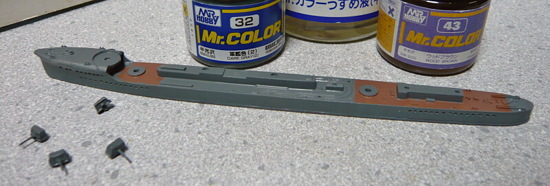 リノリウム色を43ウッドブラウンで、他を32軍艦色2で塗装。艦首甲板はウェルデッキの部分など奥まっている部分を塗ってから接着した方がスマートか。