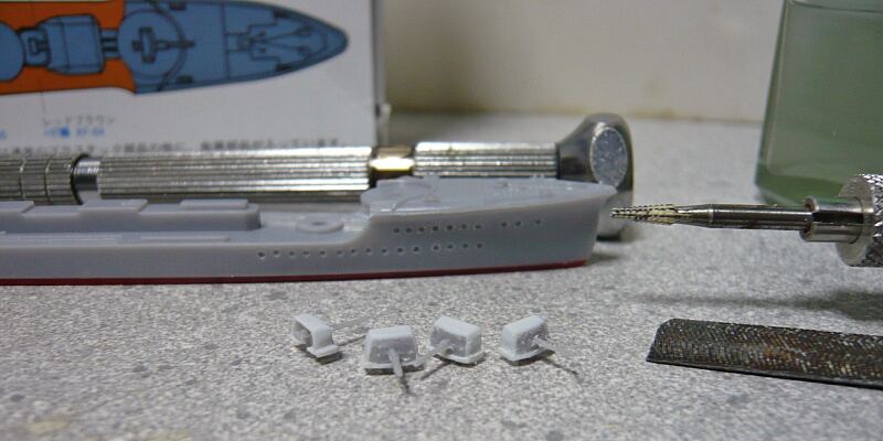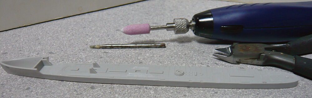 まずは説明書通り魚雷発射管の基部を2つ、魚雷格納庫や艦尾の機雷投下軌条などを削ります。まずタミヤの薄刃ニッパーなどで大雑把に切り取り、リューターで面を平らにしました。