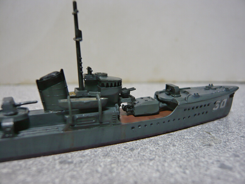 各部を観察。建造当時流行っていた機雷戦に対応のスプーン型艦首と短船首楼上の甲板後端に45口径三年式12cm単装砲。その後方ウェルデッキに六年式53cm連装魚雷発射管が・・・ありません。おそらく爆雷装備で重くなった分の軽量化のためだと思うのですが、1・3番魚雷発射管は撤去されています。艦橋は睦月型で行われたような密閉型への改装はされておらず、オープントップの羅針艦橋に幌屋根を被せたもののまま。艦橋左右の6.5mm機銃が置かれていた段は前方へ延長されて左右と繋がり、2基の九六式25mm連装機銃が設置されています。マスト前面に13号電探が設置されているのも確認できます。