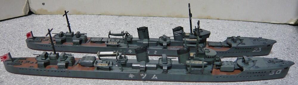 喫水の高さがかなり違うため結構印象が異なります。前述のように艦橋前の機銃が長月では連装2基に増備されており、艦橋左右のカッターの下の構造は長月の方が正しいです。