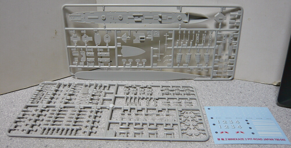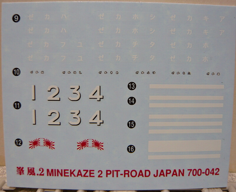 名前デカールは7番艦~12番艦までの羽風(はかぜ)・秋風(あきかぜ)汐風(しおかぜ)・夕風(ゆうかぜ)・太刀風(たちかぜ)・帆風(ほかぜ)のものが付属。駆逐隊番号も付属しますが戦間期のうちに解隊されているし装備も大戦末期なので旗以外は使わないのが本来なのかも。お好みで。