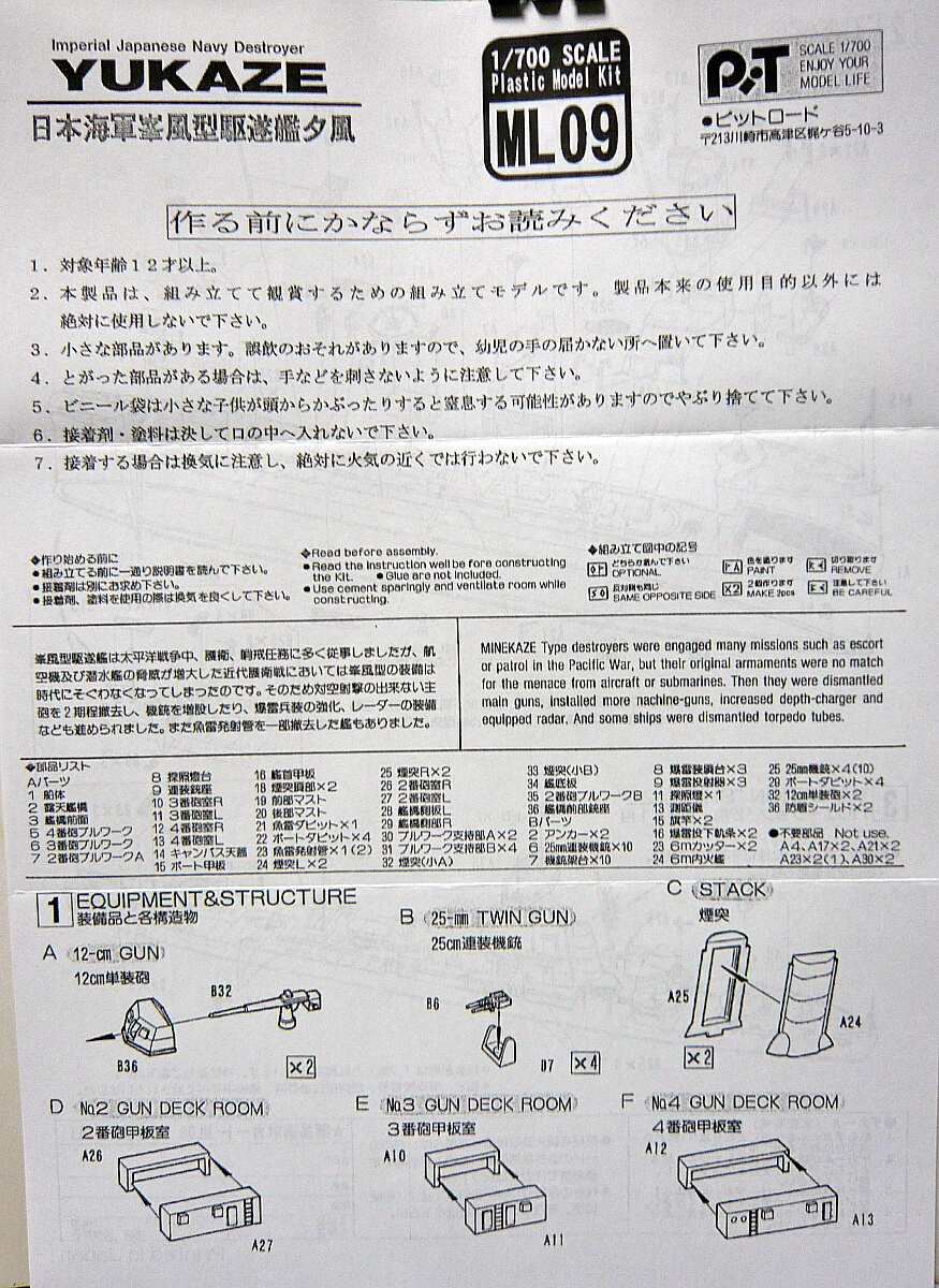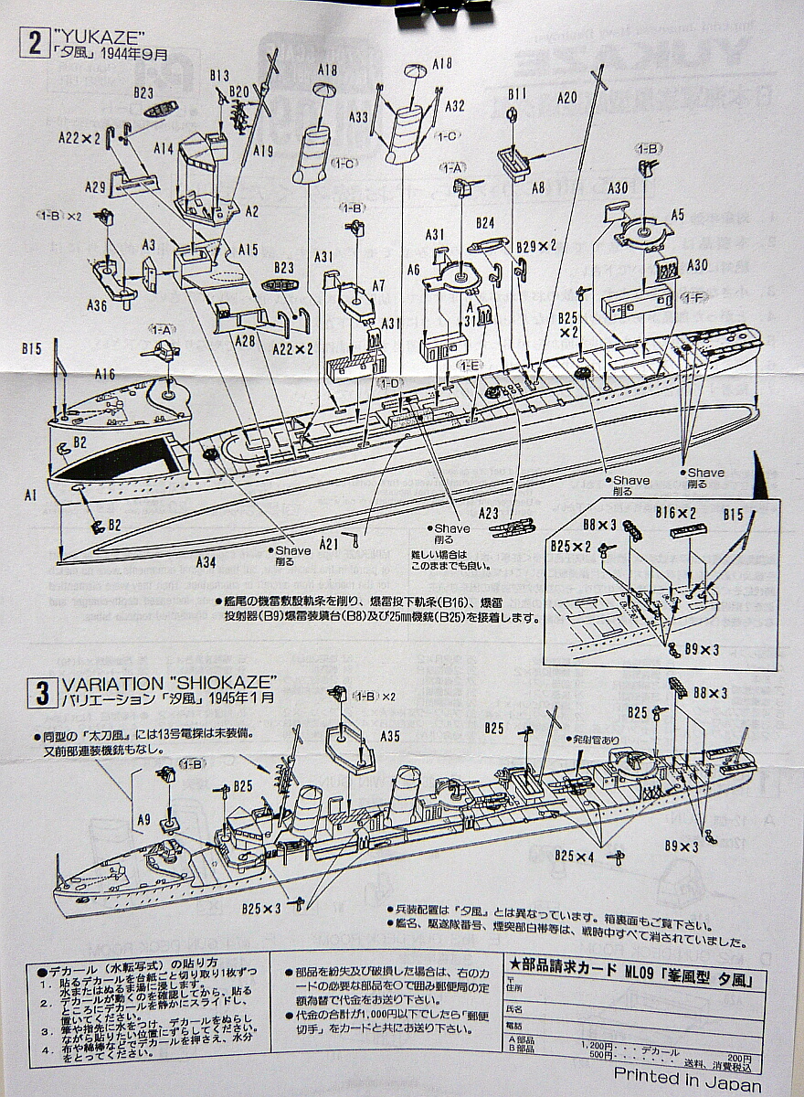 説明書。読む要素が少ない・・・説明書では夕風の1944年9月仕様と、同型艦である汐風(しおかぜ)の1945年1月仕様の組み立て図が書かれています。竣工時~太平洋戦争中盤頃までの仕様で組む場合は別途資料が必要。また、甲板上のモールドを削って真っ平らにしなければならない部分もあり、ちょっと初心者の方には厳しいかも。