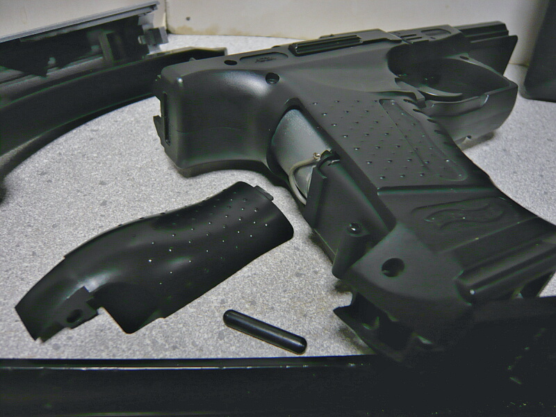 グリップの後ろ、下の方に貫通して刺さっているピンを抜くとグリップ後面が外れます。ネジが1本出てくるのでこれも抜きます。