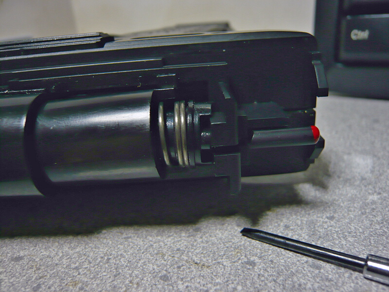 アウターバレルの付け根上側に短いネジが1本あるので抜きます。銃口に差し込まれているパーツも外しますが、ちょっと固いので継ぎ目に精密ドライバーのマイナスを差し込むなどしてこじり外します。