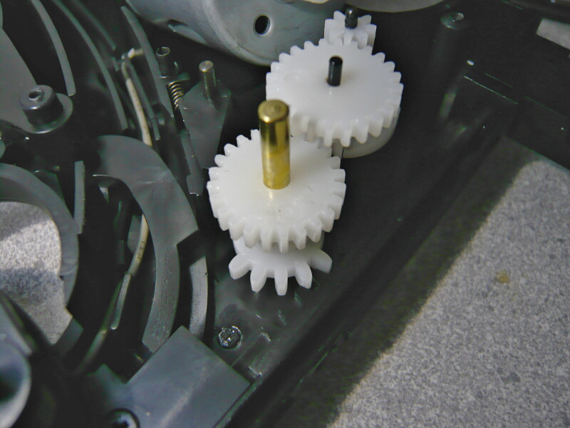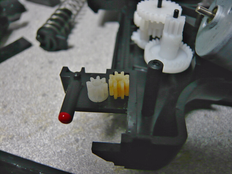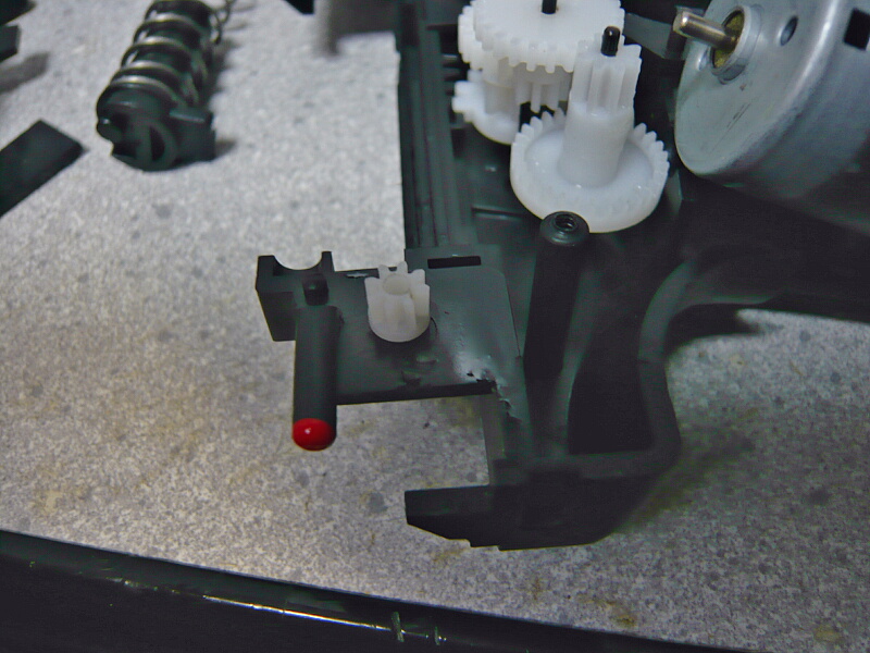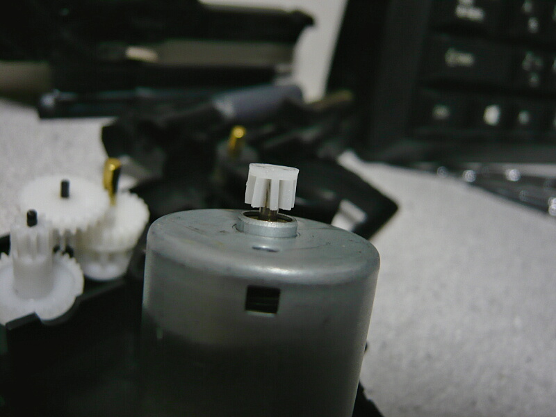 さて故障箇所。モーターのシャフトにはめ込まれているピニオンギヤが歯車の溝の部分で割れています。スライドを重くしたために過負荷が掛かって一番弱いここが破損し、モーターが空回りしていたのです。構造上ここは強化に限度があり、金属ピニオンでも使わない限りどうしてもウィークポイントになってしまうでしょう。