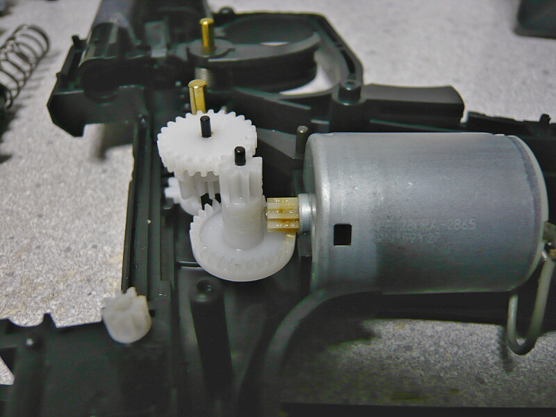 駆動部分。基本的なしくみはマルイの高い方の電動ガンの仕組みと同様です。モーターの動力をピニオンギヤ、ベベルギヤ、スパーギヤ、セクターギヤを介してピストンの下にあるラックギヤを駆動してピストンを引きます。ただし逆転防止ラッチは多くの電動ガンのようにべベルギヤの軸周りにあるノッチに掛かるのではなく、セクターギヤの歯車に直接掛かっています。