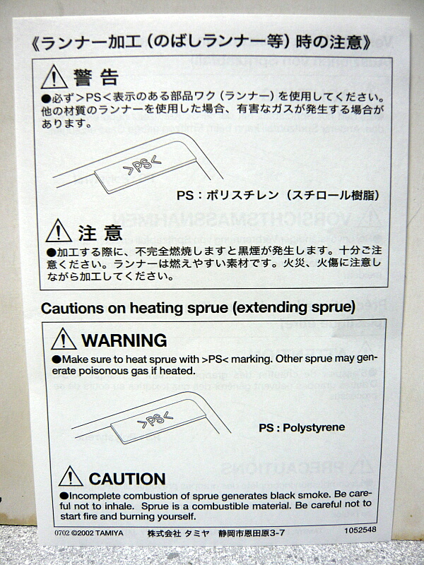 1枚ピラ紙が付属。>PS<と書いてあるランナー以外は伸ばしランナーに使うな、というもの。キットにはPSのランナーしか無いので特に気にする必要はありません。ただ自動車のキットとかだとたまにライターで炙って伸ばしたら伸びずにブチッと千切れるものとかありますね。ガンプラによく入っているABS樹脂やポリキャップなんかのランナーは伸ばしランナーには使えません。