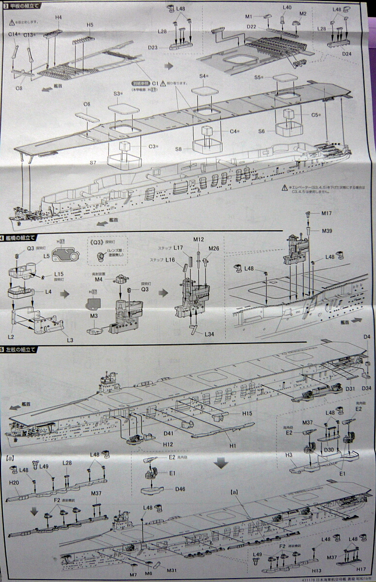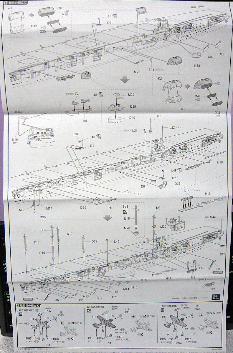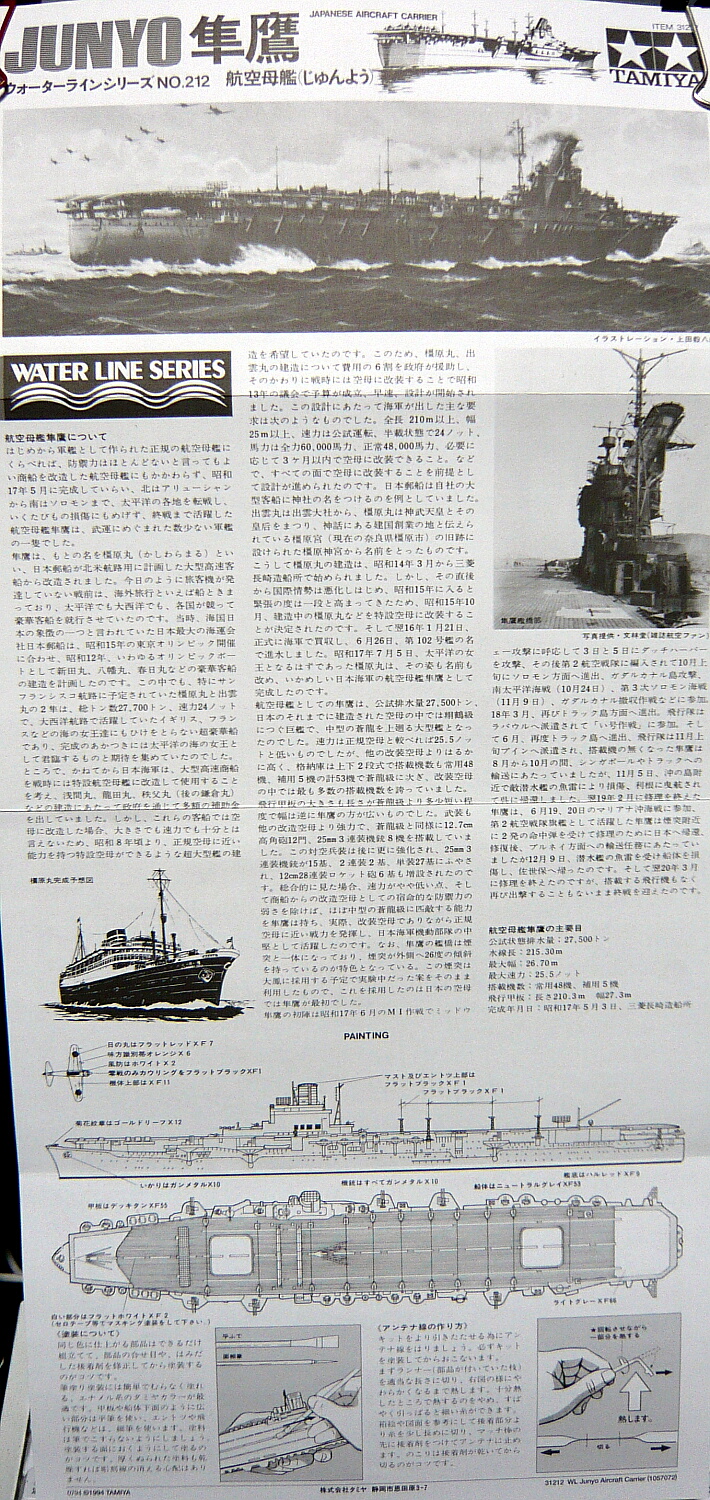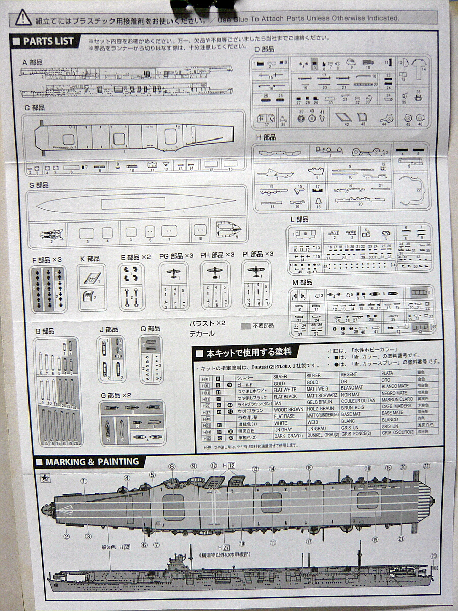 説明書は縦長の1枚。元々付いてる折り目でたたむと読みづらいので項の境目で3つ折りに折り直すと作業中読みやすいでしょう。1994年に作り直されている説明書ですが、塗装指示は飛行甲板の下になる部分などが不足気味。付属の艦載機の塗装指示については全く無いので別途資料が必要です(ググれば十分ですが・・・)。