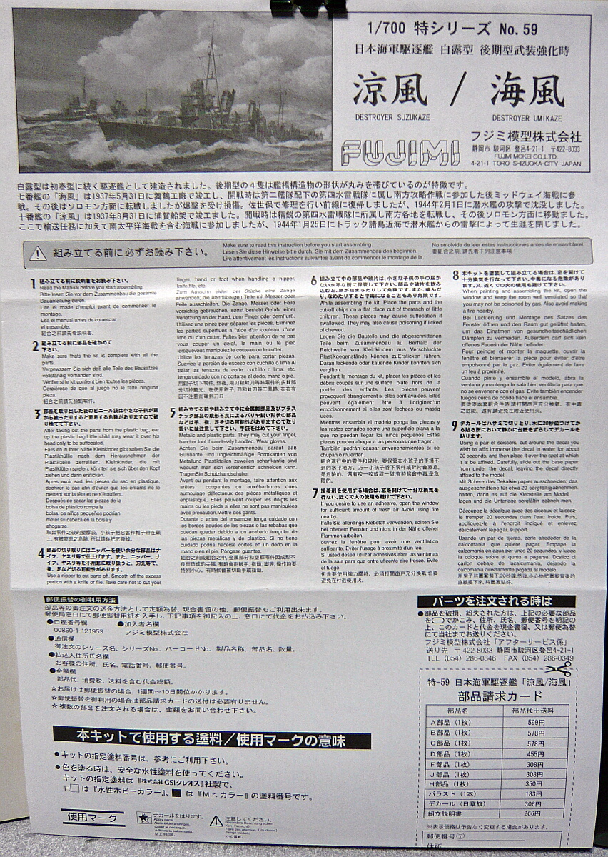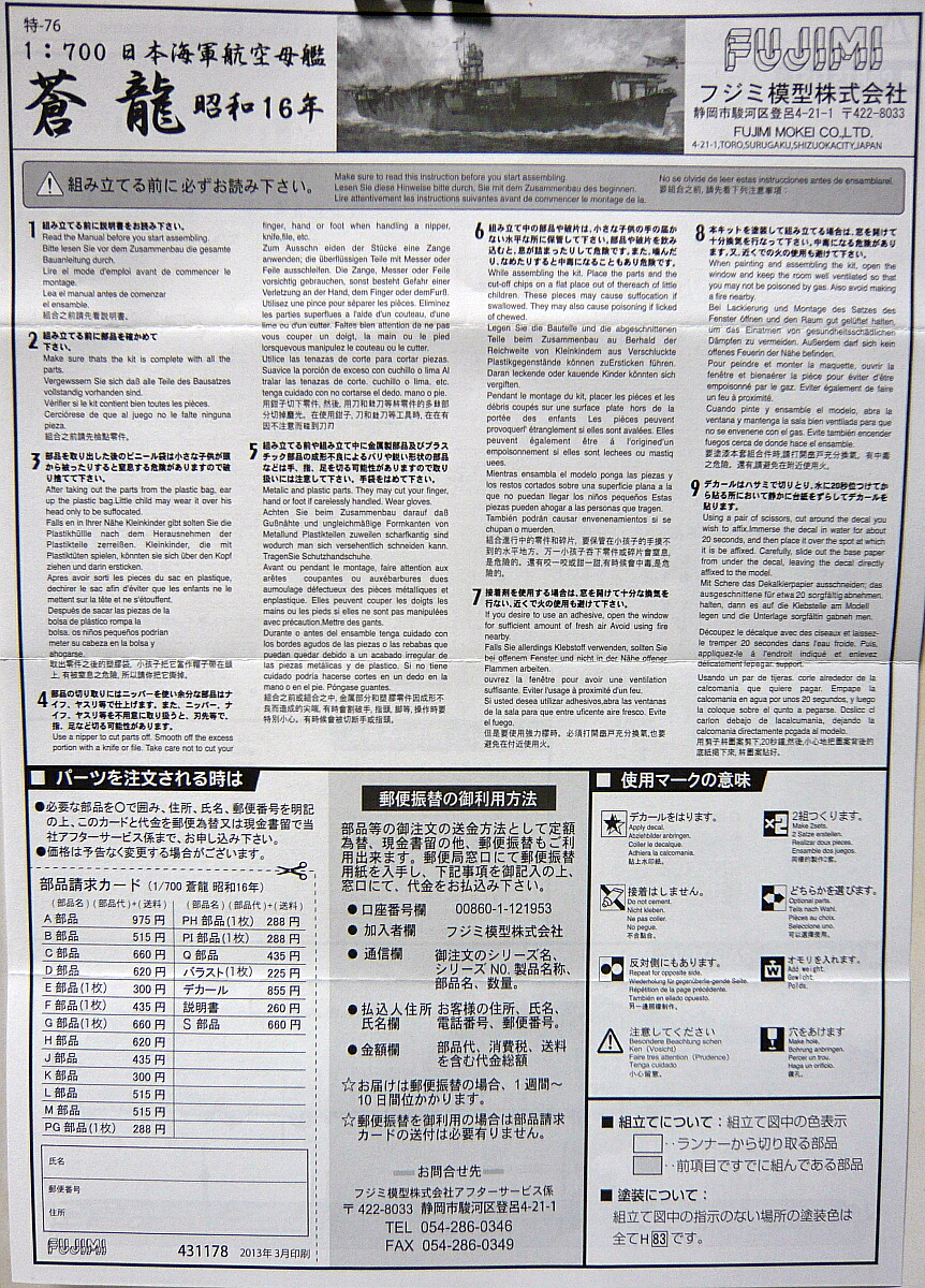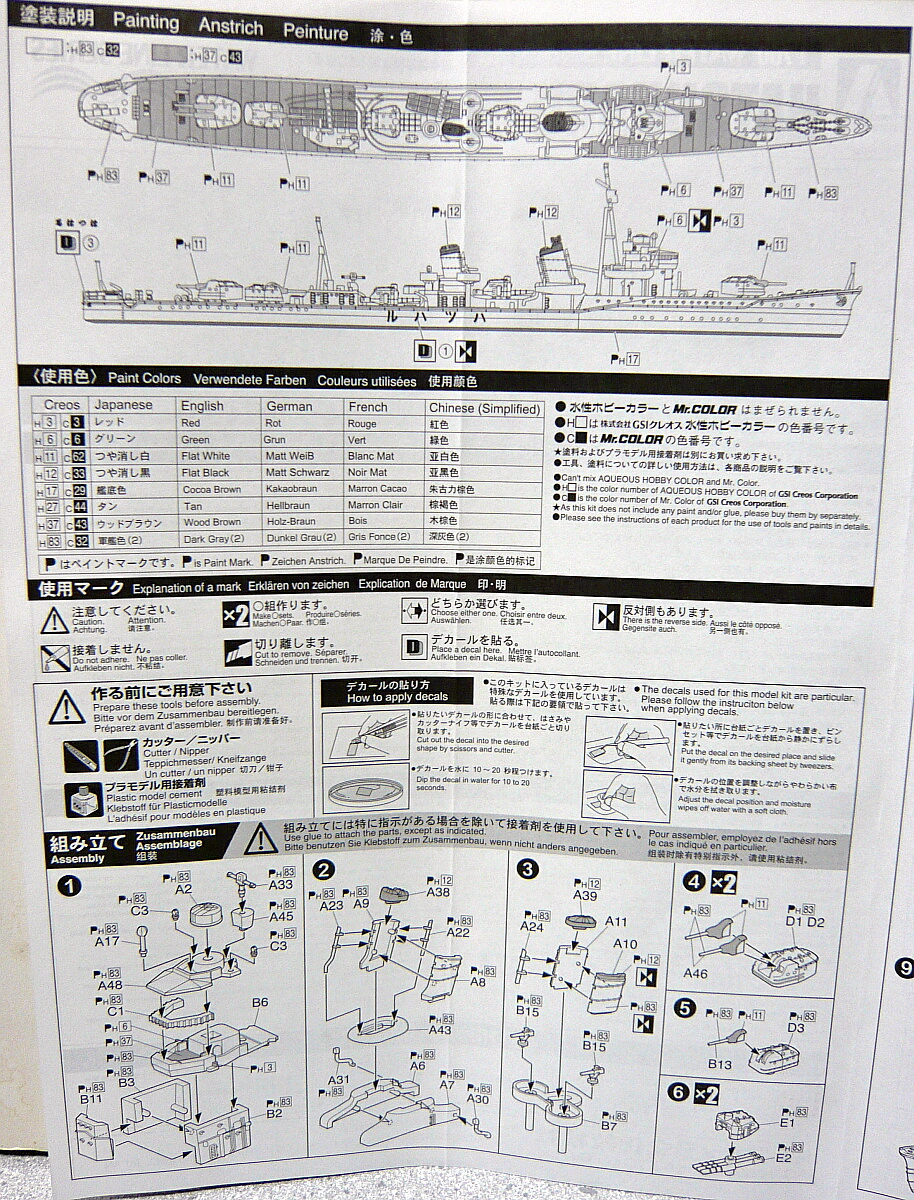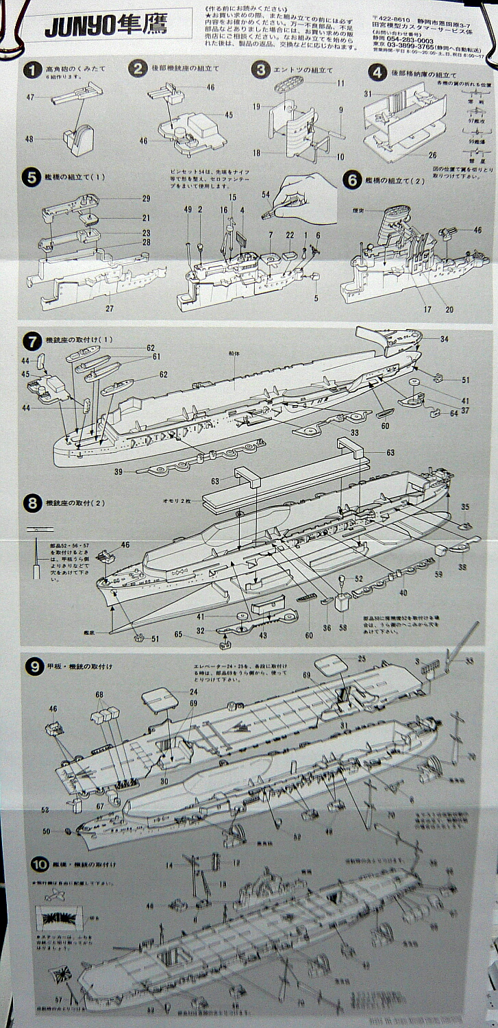 説明書は縦長の1枚。元々付いてる折り目でたたむと読みづらいので項の境目で3つ折りに折り直すと作業中読みやすいでしょう。1994年に作り直されている説明書ですが、塗装指示は飛行甲板の下になる部分などが不足気味。付属の艦載機の塗装指示については全く無いので別途資料が必要です(ググれば十分ですが・・・)。