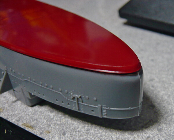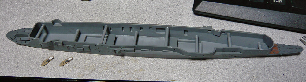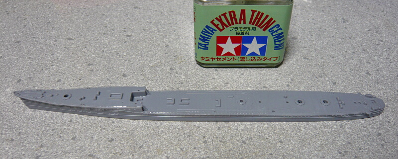 早速手始めに船体と艦底パーツを接着しますが、艦尾あたりなどは多少合いが悪くなっているので適宜に擦り合わせてやります。