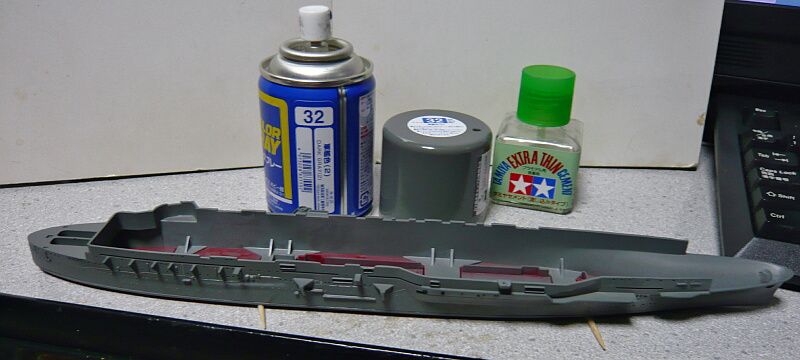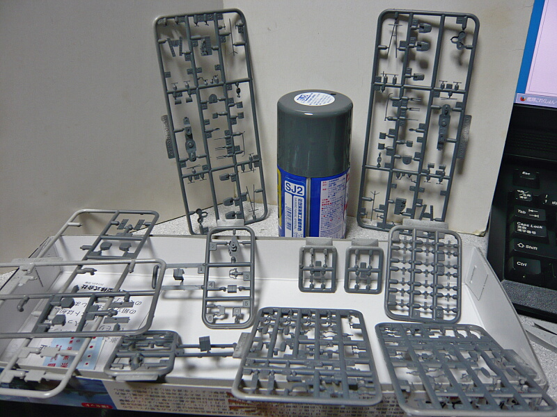 パーツが多いなら塗装はスプレー塗装をすると手間を減らせます。前回の隼鷹で使いすぎたのかこんなもんなのか、船体と飛行甲板に吹いたら尽きてしまったのでもう1本、しかし買っていたのは軍艦色2じゃなく佐世保海軍工廠標準色!いやネット注文したらさ、これが在庫ありで軍艦色2が入荷待ちだったんだよ・・・