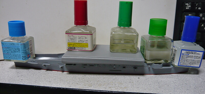 今年に入ってからコストダウンなのかバラストが省略されるようになっています。ある程度重さが無いと嫌という人には残念ですが、作業中や落下時の被害範囲などの点では軽い方が安心。軽いとちょっとした揺れで棚から落ちやすくなる、というのもありますが、艦プラはできればケースに入れて展示したいもの。
