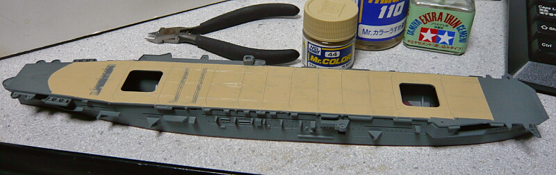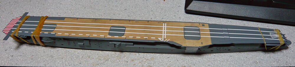船体に飛行甲板を接着。押さえてないとめくれてくるので前後を輪ゴムで、中間をセロテープで留めて乾燥待ち。