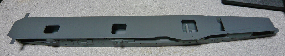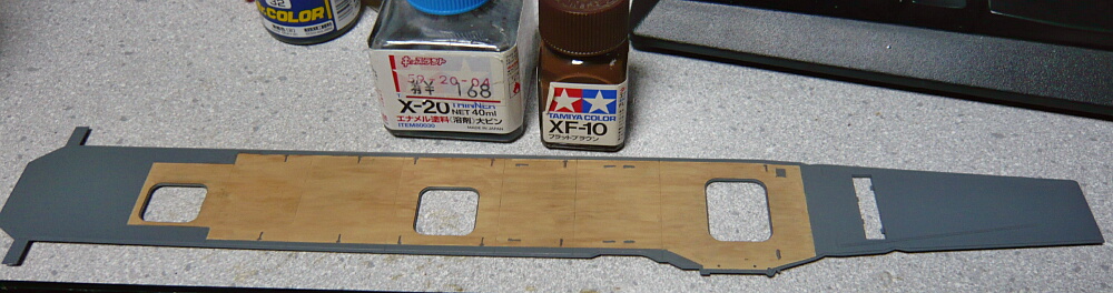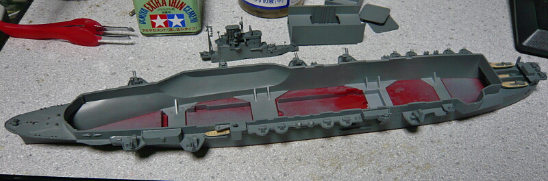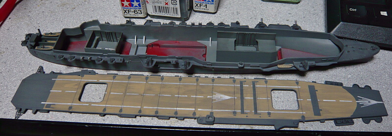 飛行甲板を接着する前にウォッシングをしておきます。飛行甲板の裏をフラットブラック、それ以外をジャーマングレーで大雑把にやってしまいます。エレベーターを下げた状態にする場合、説明書だと各段に艦載機を配置していますが、折角細かく塗った艦載機がほとんど見えなくなってしまうのも悲しいので特になにも置かずにしておきます。飛行甲板接着後は後部エレベーター内に物を落とさないように注意しましょう。