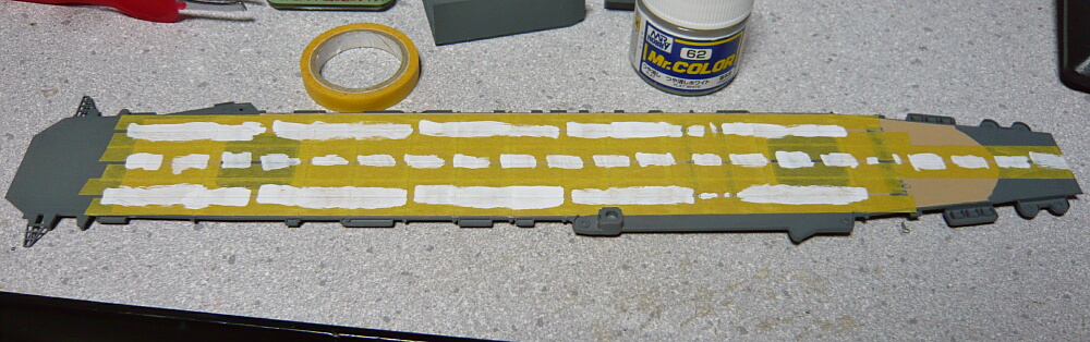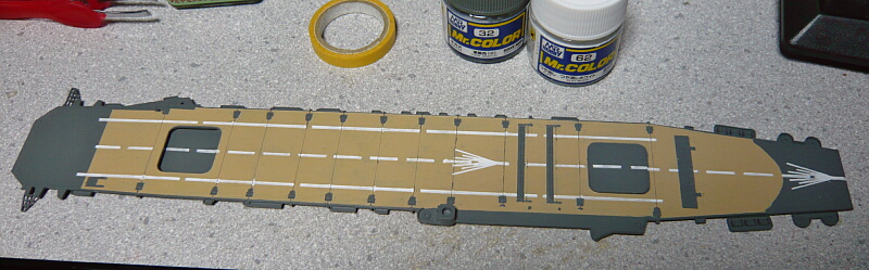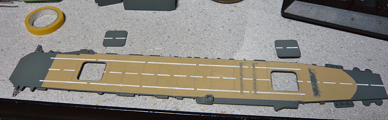 さてこのキット、デカールは付属しませんので飛行甲板の白線なども自分で塗らなければなりません。とはいえモールドは刻まれているのでそれに合わせてマスキングするだけでOK。恐れる事はありません。
