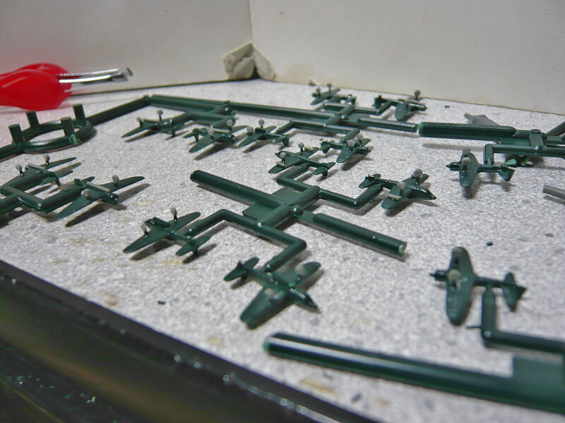 零戦の足パーツを飛ばしてしまったのでブン投げて99艦爆1機だけでやめます。これは固定脚で脚パーツが大きいので作業性は他に付属する零戦や97艦攻より良好。尾輪とかマジ・・・どっちが前か後ろかすらわからん細かさだし。