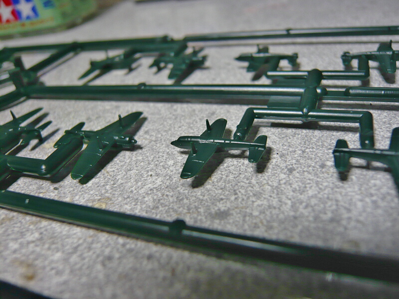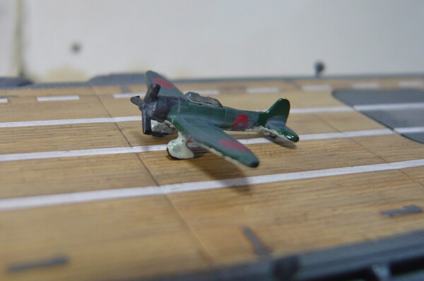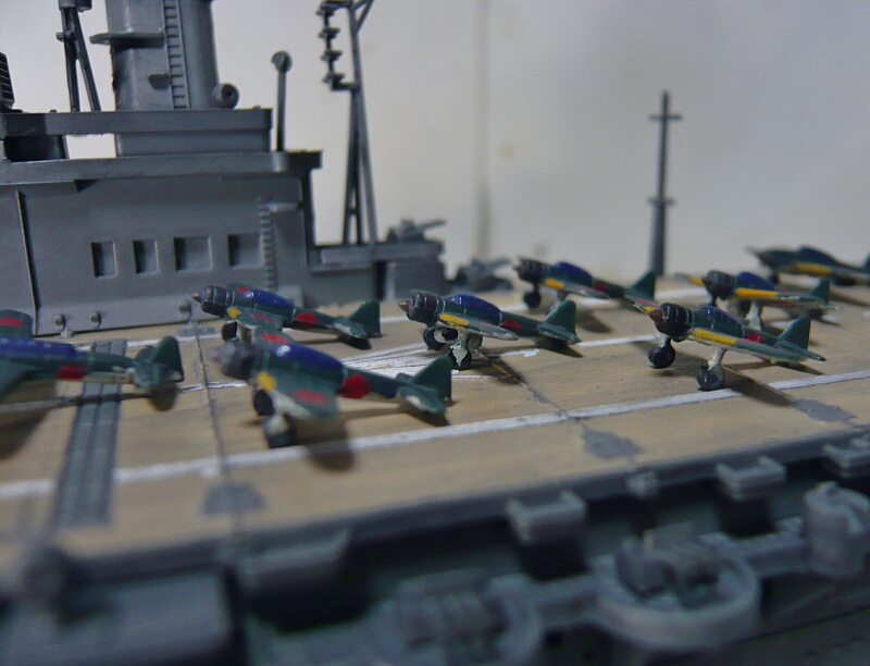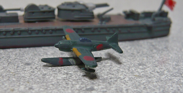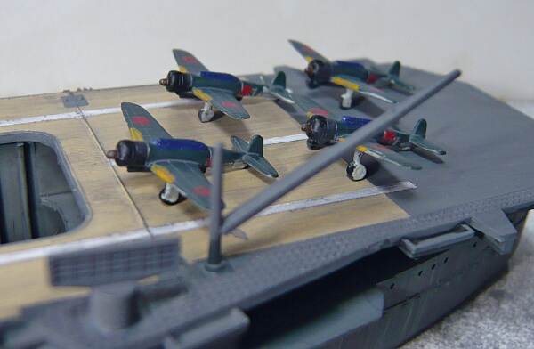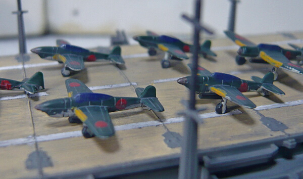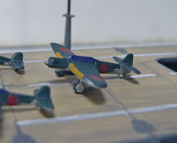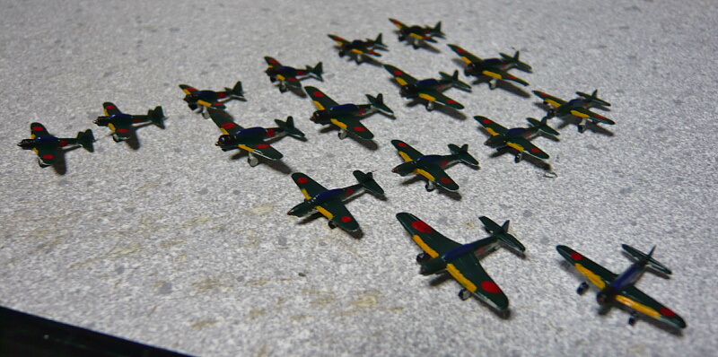 その後方6機のおなじみ零式艦上戦闘機。キットでは零戦のどの型かまでは書かれていませんが、何となく52型のつもりで。2機のみ増槽を装備した状態にしてあります。