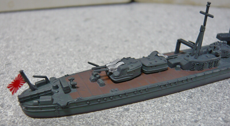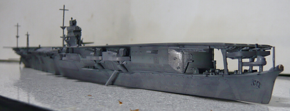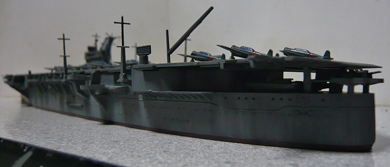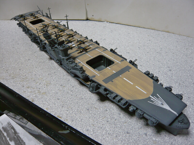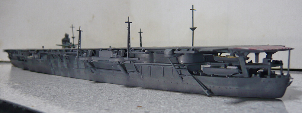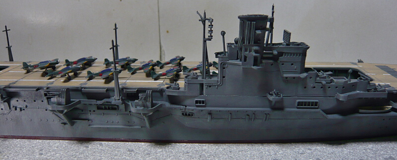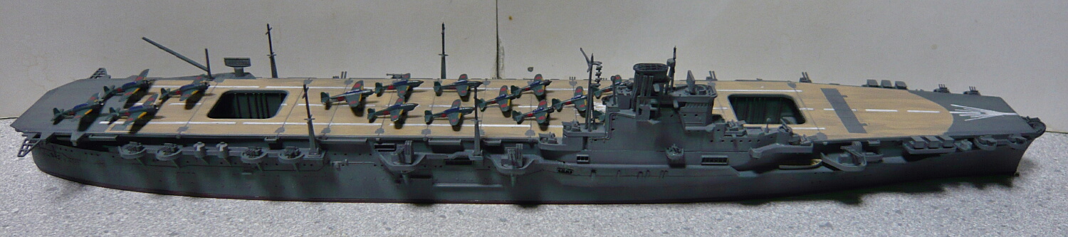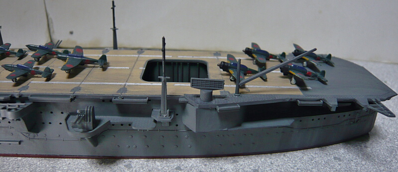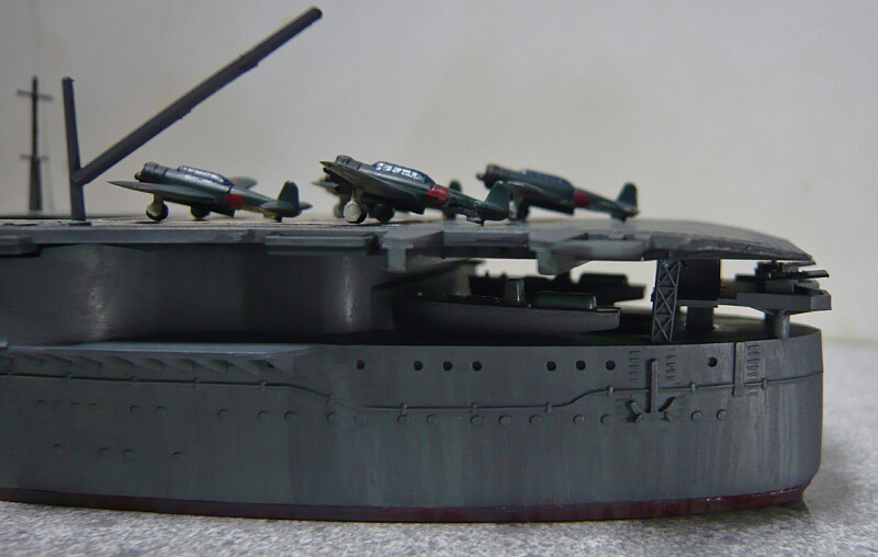 ところで箱絵だと艦全体が緑色ですが、これは最終仕様での迷彩塗装であり、艦の側面には明るい緑ベースに濃い緑で輸送艦の艦影を模した迷彩が描かれていたり、甲板も瑞鳳のような迷彩柄だったようです。今回の塗装のように普通の色をしているのは姉妹艦の飛鷹共々1943年頃まででしょうか?(飛鷹も1943年後半には防火のため木甲板が剥がされるなどしてやや様相が変化していたようです。)