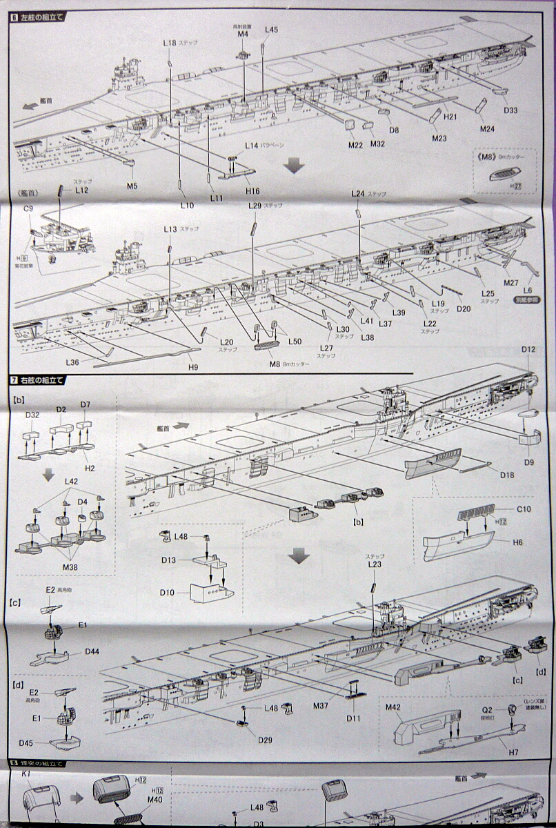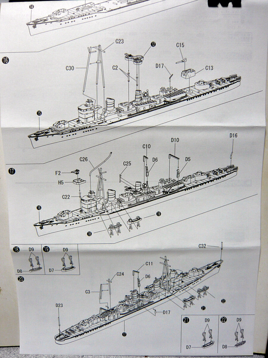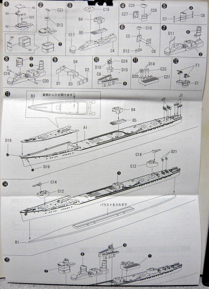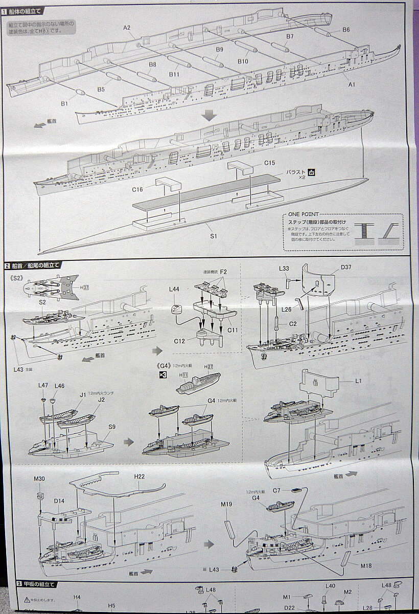 説明書はB4版を2枚折りにした1枚紙。箱に収めるためもう1回折ってあり真ん中に折りクセがついています。分かりにくいところは特に無いのですが、甲板上の構成が左右非対称なのでできれば完成状態の左舷側の図も欲しかった感じ。