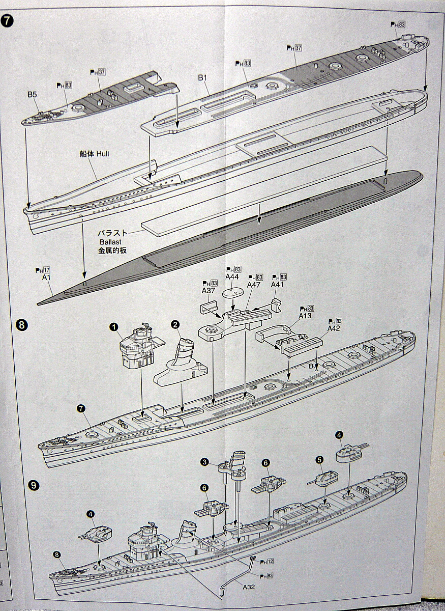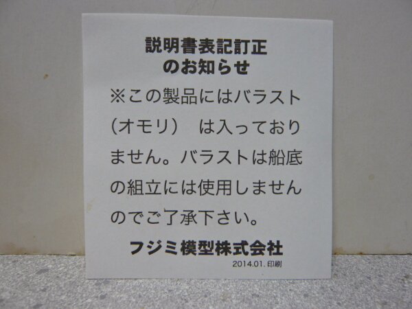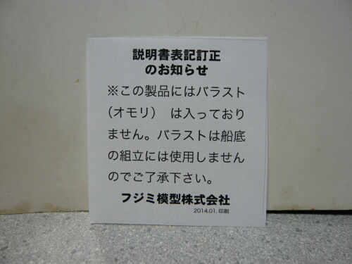 最後の1枚、説明書内でバラストを組み込んでいるものの、バラストは付属しません。という補足。前回の隼鷹で使わなかったバラストがそのまま使えそうでしたが、あちら以上に持つ時に重量があると危険なキットなので無い方が良いでしょうね。