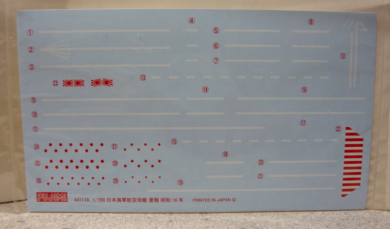 デカールは飛行甲板の白線がメイン。エレベーター上に貼るものだけはまとまっていてクリア部分が多めですが他はクリア部分がほとんどなく、白線を1本1本チマチマと貼らなければならないものの仕上がりはキレイになるはずです。