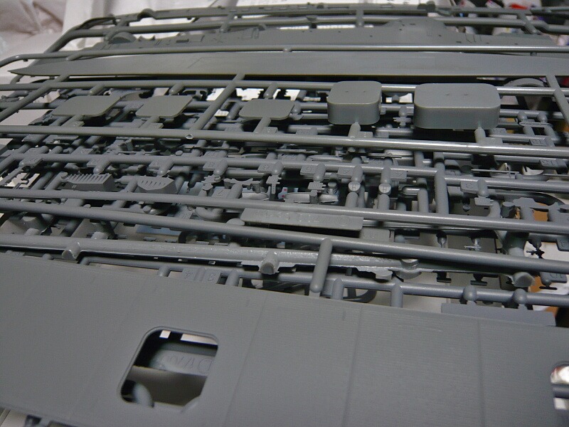 主要パーツ群。でかいので机に全部並べられないので写真2枚。ランナー1枚が巨大なのでパーツを切り取ろうとして振り回して組み上げ中のキットにぶつけたりしないように注意しましょう。見ての通り大きいもののパーツ数はそれほど多くはありません。