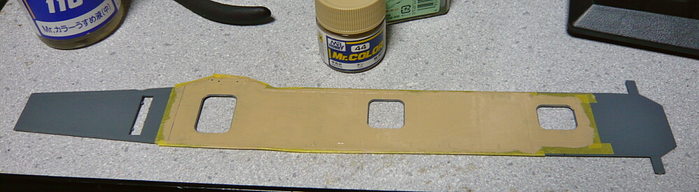 マスキングをして木甲板部分を44タンで塗ります。モールドが浅くて塗膜を厚くしちゃうと埋まりそう。できればスプレーで。筆塗りなら多少ムラが残ってでも薄く。