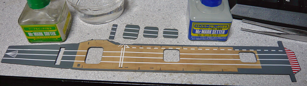デカールを貼ります。白線を貼るエレベーターなどのパーツは裏からセロテープ留めして飛行甲板パーツに当てておき、白線パーツを貼ってゆきます。前々回の祥鳳のデカールと同様に貼りやすい中々良いデカールです。
