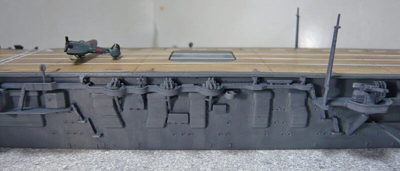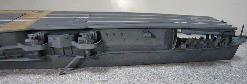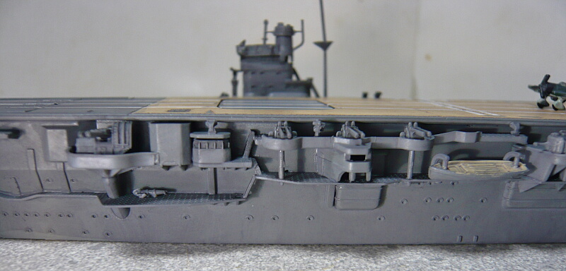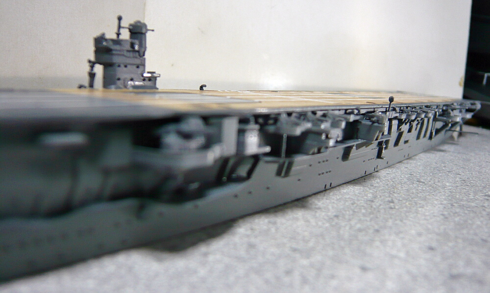 飛行甲板の高さより上は小さな島型艦橋のためあっさりしていますが側面はフジミ特シリーズらしい高密度。