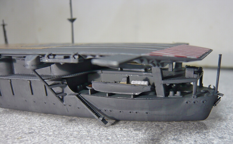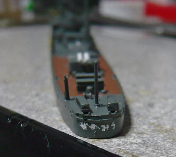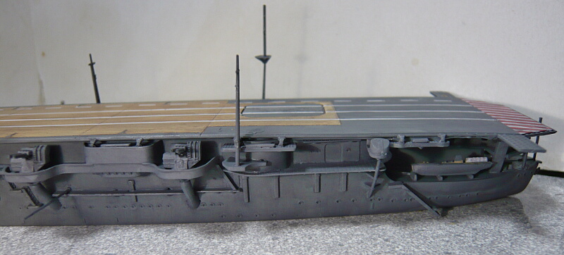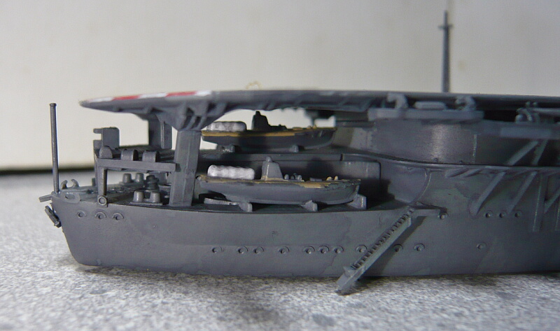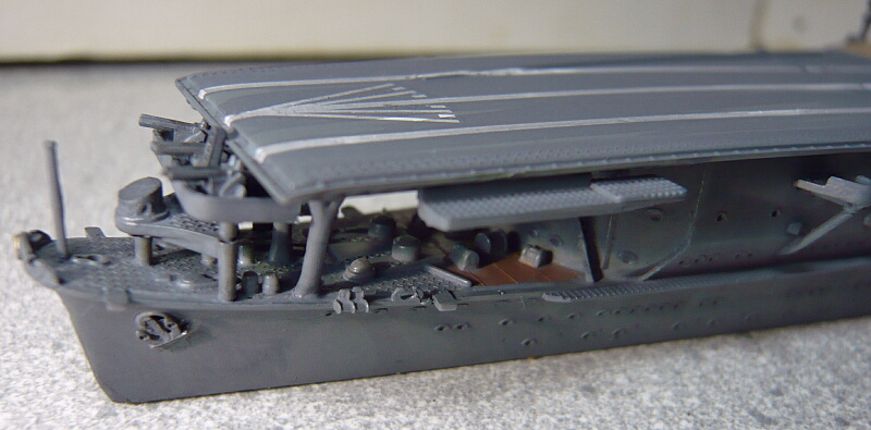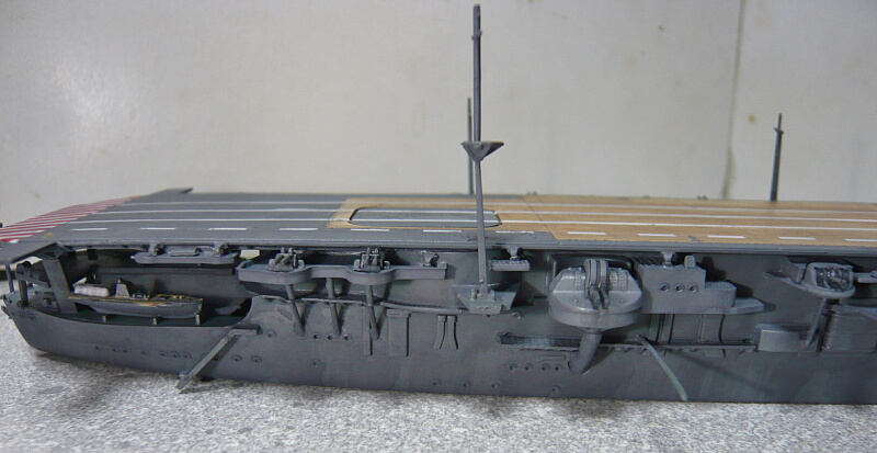 軍艦色2で細かい所をチマチマと。余力のある人は飛行甲板後端の着艦標識(赤白の縞模様)に挑戦しても良いでしょう。
