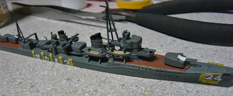 ただ、あまりにも全く同じものが2つ出来上がるだけすぎるので名前を書いておきましょうか。罫線代わりにマスキングテープでおおよその位置決めをして面相筆フリーハンド。名前はカタカナゴシック体で右から。戦隊番号の24も艦首の左右に書きます。