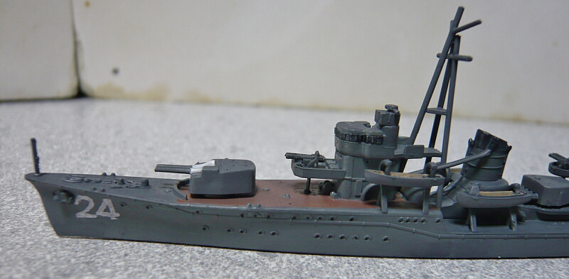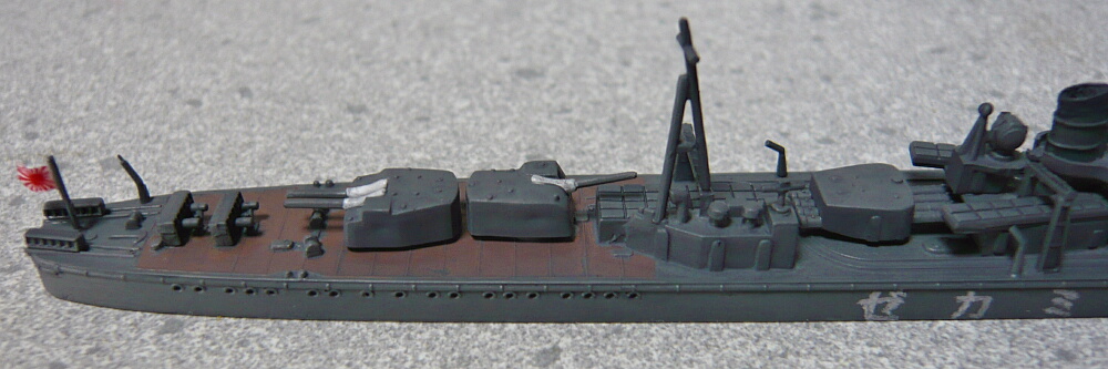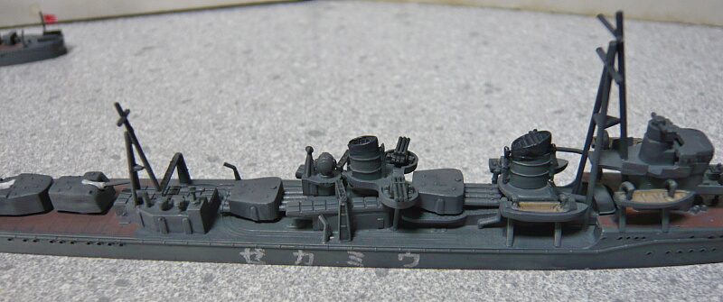 開戦時と対空兵装強化時の違いは主に艦橋前の機銃台の有無で、対空兵装強化時と最終時の違いは12.7cm単装砲塔が機銃台に代わり、前マストに22号と13号電探の有無。海風・涼風と山風・江風は改白露型なので艦橋のパーツが違うハズ。