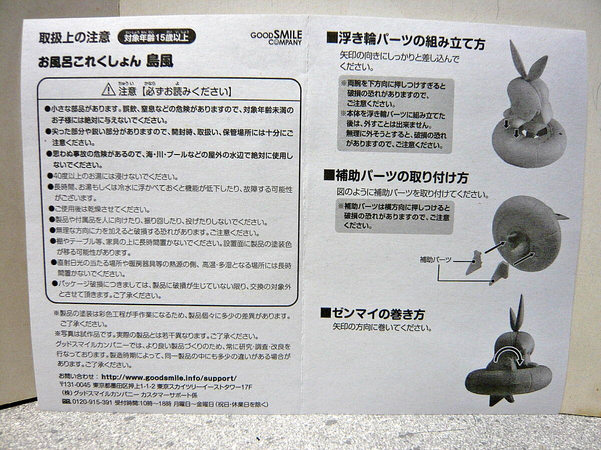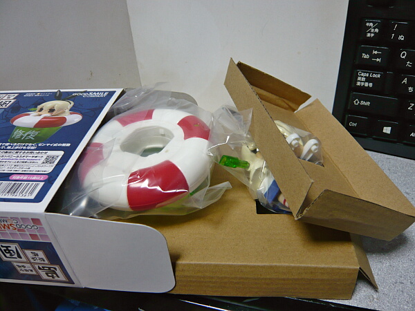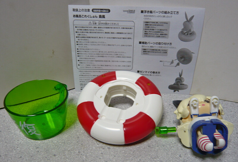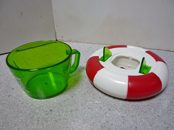 クリヤーグリーンのマグカップ状の、横に「修復」と書かれた高速修復材、通称「バケツ」と、フロートとなる浮き輪。説明書には浮き輪の下面に補助パーツを後から取り付けていますが、開封時には元々取りついていました。浮き輪の上側後方には2つ空気穴が開いており、ここから水が入るとしまいには沈んでしまうかと思われます。