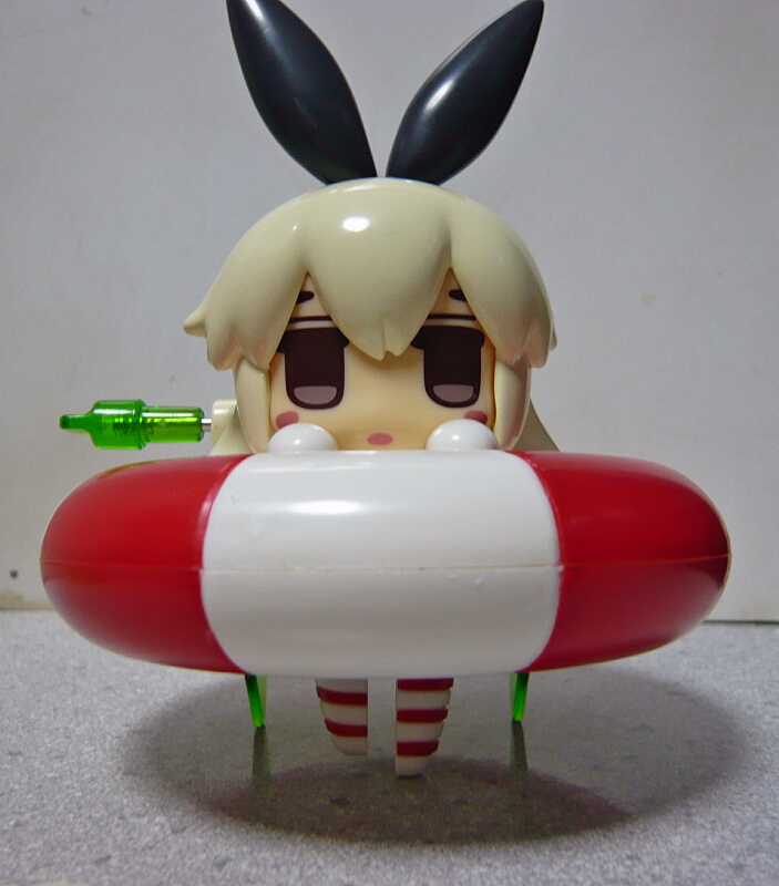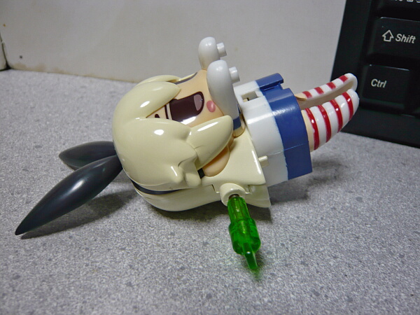 島風本体。立たないのでこんな姿で失礼。右側頭部から棒が突き出ており、ここを回す事でゼンマイが巻かれますが、足を押さえながらでないとうまく巻けません。全体的にテカテカしています。