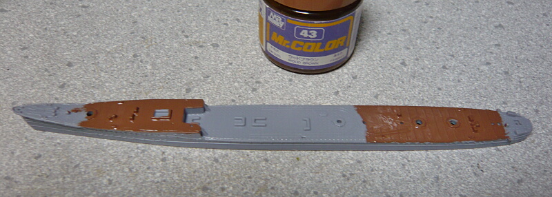 その間船体側は筆塗りでやってしまいます。まずはリノリウム色として43ウッドブラウンを。