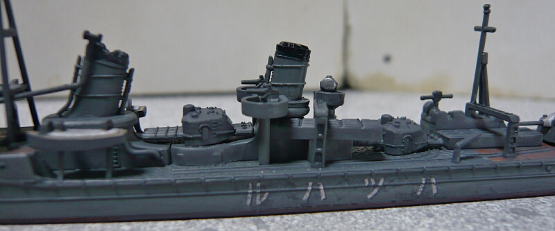 パーツの合わせがギチギチにきつい部分が多少あり、機銃台を後部煙突にかぶせる所、またその下の次発装填装置も取り付ける時きつい感じがします。マストは前も後ろも2本を合わせる面が何も面取りされていないので仕上がりの見栄えがイマイチに感じるかも。一方でボートダビットなどは他キットよりもかなり取り付けやすく感じました。