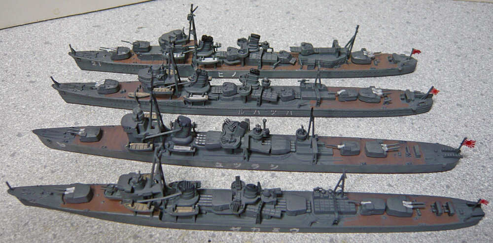 奥(上)から子日1933、初春1941、白露、海風。条約型の1400t級駆逐艦の始まりから最後まで。もっとも、初春でさえ最終的には1700t程度と特型駆逐艦と同等まで重量が増えていたそうです。