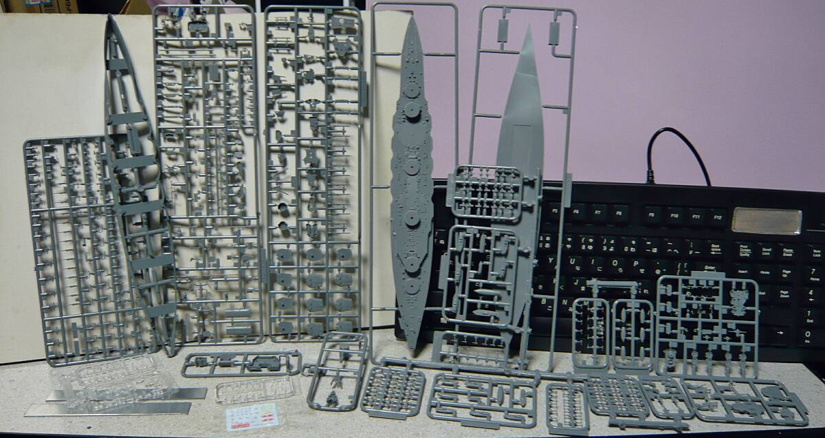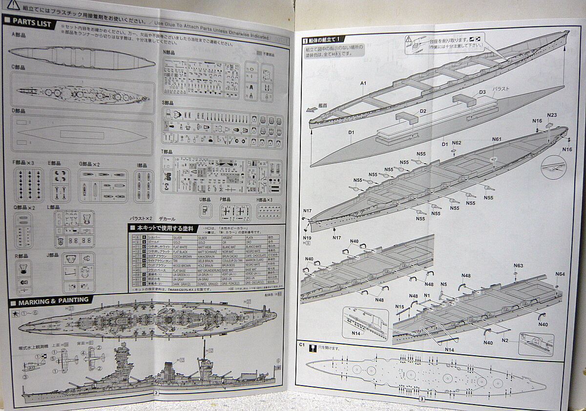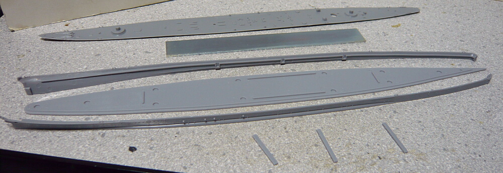 それでは製作開始。説明書の順序では砲塔や煙突・艦橋などから組みますが、いつも通り船体から組んでしまいます。構成は艦底と甲板・艦舷左右とバラスト、補助用の梁が3本。