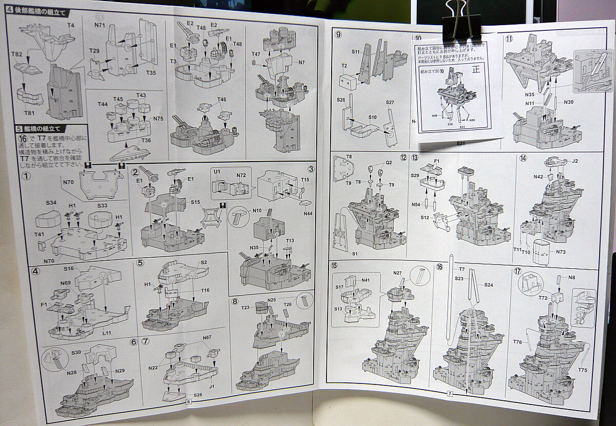 もうちょっとで完成です。艦橋は何かちょっと曲がって見えますが、ジェンガに例えられるこの不安定な艦橋形状のせい・・・ではなく、実際に若干傾いている段があります。パーツの合いがお世辞にも良くないため(特にダボの径が穴より悉く大きめになっていて接着剤で溶解させないとスッと取りつかない部分多し)、部分部分で傾いて取りついたり浮いたり潰れたりしていて、中央を縦に貫通する軸パーツ(T7)も最終的には長すぎて合わなくなるので切り詰める必要があります。