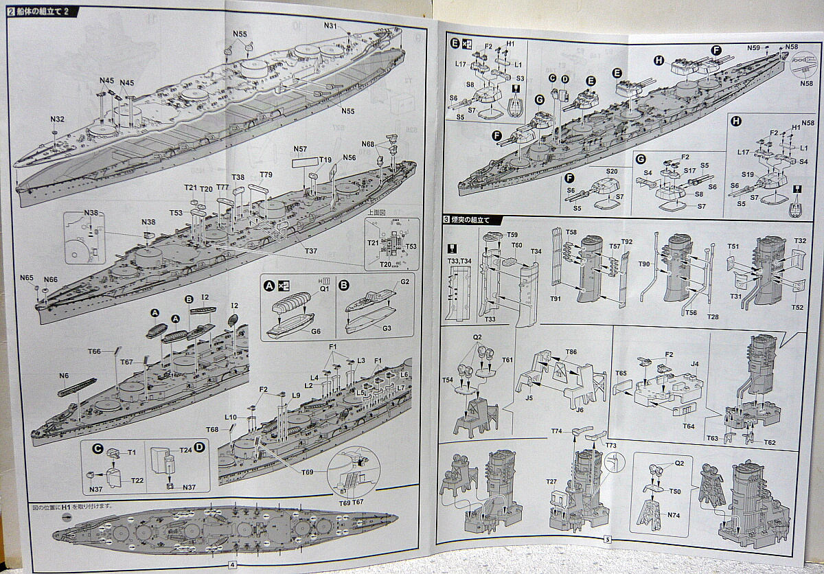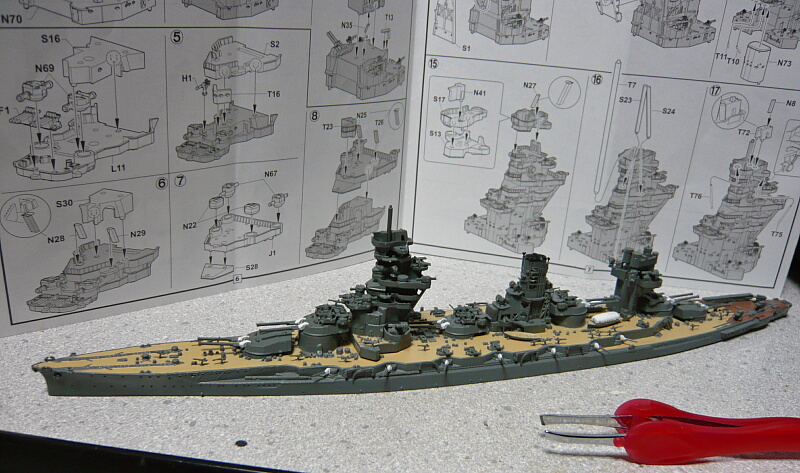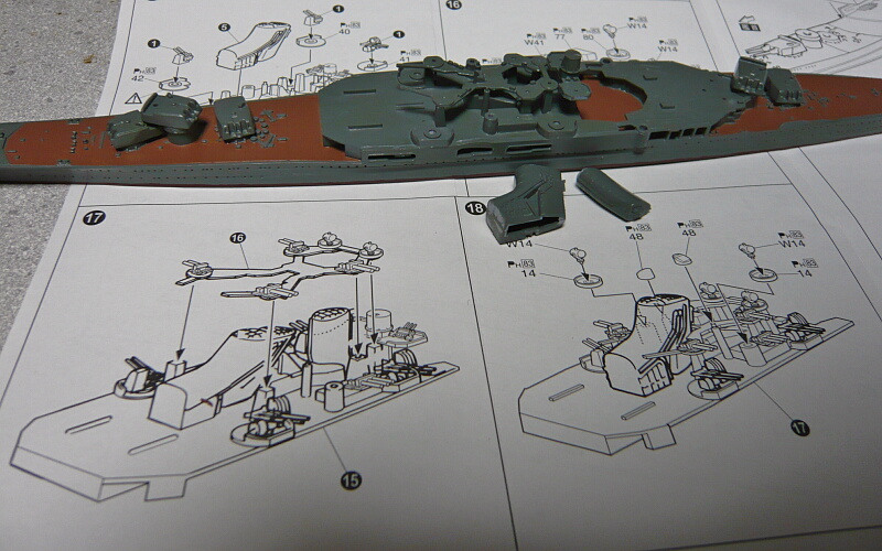 煙突→後部艦橋→前部艦橋の順に組み上げて船体に載せます。上写真はまだ前部艦橋が途中。