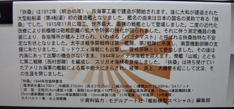 戦艦だけあって迫力満点。特にこの扶桑は戦艦としては短めな船体に喫水線から50mと言われる背の高い艦橋があるため圧巻です。