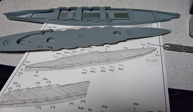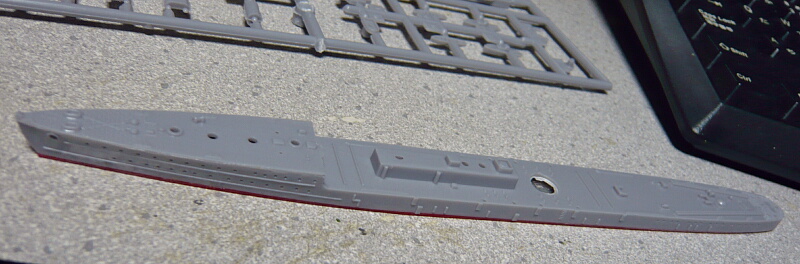軍艦色2を塗り、艦底色も塗ります。船体側面に何のディテールも無いので側窓をキリで軽く掘ってみましたが、みすぼらしいので右舷側だけ・・・